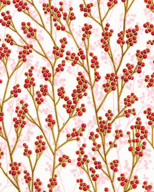 Thin branches laden with small berries are scattered across the design with metallic accents adding a festive flourish. Larger berries are about 1/4", with gold metallic, from the 'Holiday Flourish - Festive Finery' collection by Studio RK for Robert Kaufman Fabrics.