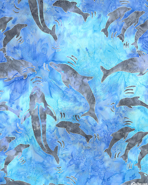 Dolphins swimming playfully in the sea are depicted in vivid hues within mottled batik textures. Batik, larger dolphins are about 5-1/2", 'Dolphin' from the 'Bali Under The Sea' collection by Benartex Fabrics.