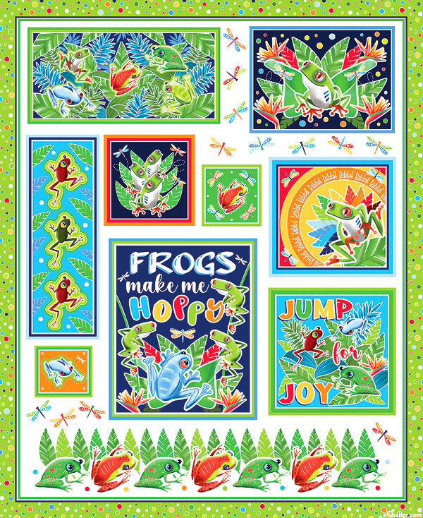 In this panel, a friendly gathering of adorable rainforest frogs hop across this energetic design. 36" panel, with glow-in-the-dark, 'Rainforest Glow Panel' from the 'Rainforest Glow' collection by Kanvas Studio for Benartex Fabrics.