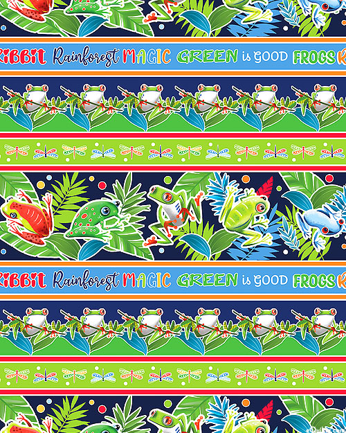 A friendly gathering of adorable rainforest frogs hop across this energetic design. Wider stripes are about 4", with glow-in-the-dark, 'Rainforest Glow Stripe' from the 'Rainforest Glow' collection by Kanvas Studio for Benartex Fabrics.