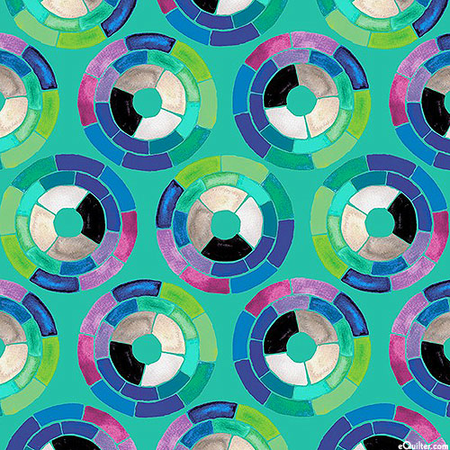 Color wheels one might use as a paint palette are scattered against a solid background in this charming design. Larger circles are about 2", 'Wheel of Color' from the 'Mess Maker' collection by The Paper Curator for Michael Miller Fabrics.