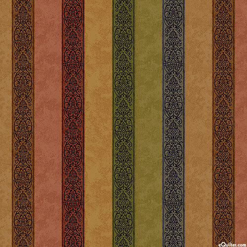 Alternating stripes contain filigreed columns with subtle textures in the space between. Digitally printed, wider stripes are about 3/4", stripes run the length of the fabric, 'Glory' from the 'Old Masters' collection by Michael Miller Fabrics.