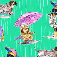 Adorable puppy dogs stay dry in the rain with umbrellas and rain coats in this cute and cuddly design. Digitally printed, larger dogs are about 3-1/2", 'Dogs In The Rain' from the 'Paws In The Rain' collection by Michael Miller Fabrics.