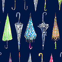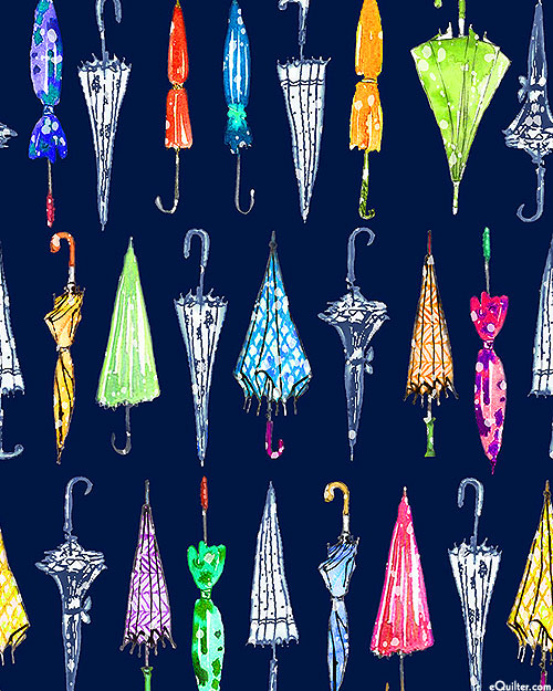Colorful umbrellas are neatly arranged into rows across the design. Digitally printed, larger umbrellas are about 3", 'Pick Your Umbrella' from the 'Paws In The Rain' collection by Michael Miller Fabrics.