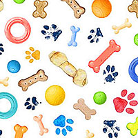 A playful scatter of toys and treats are tossed across the design including bones, frisbees, and fetching balls. Digitally printed, larger bones are about 1", 'Dog Toys' from the 'Paws In The Rain' collection by Michael Miller Fabrics.