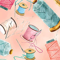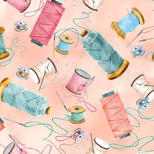 Spools of vintage thread are designed in a watercolor style and are tossed atop this plain fabric alongside bobbins. Digitally printed, larger objects are about 3", 'Fancy Threads' from the 'Sew In Love' collection by Nicole DeCamp for Benartex Fabrics.