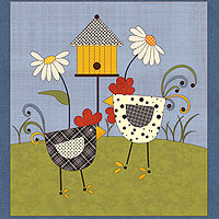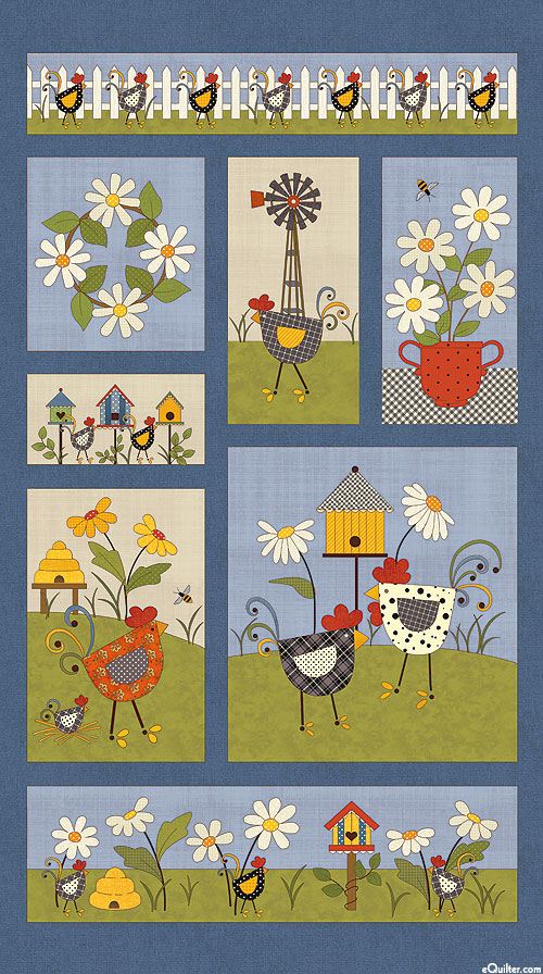 Panel blocks contain artsy depictions of cute patchwork chickens, flower pots, birdhouses, and floral wreaths. 24" panel, 'Prairie Chicks Panel' from the 'Prairie Chicks' collection by Cheryl Haynes for Benartex.
