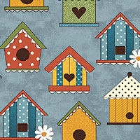 Cute birdhouses patterned in various colors and styles are depicted against a mottled background in this charming design. Larger bird houses are about 1-1/4", 'Tweet House' from the 'Prairie Chicks' collection by Cheryl Haynes for Benartex.