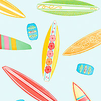 Surfboards patterned in various colors and styles lend a tropical charm to this beach-themed design. Larger surf boards are about 3", 'Surfboard Paradise' from the 'Santa's Vacation' collection by Andi Metz for Benartex.