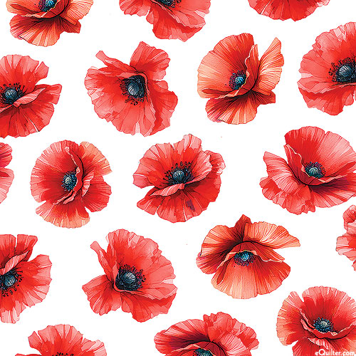 Elegant poppy blossoms are scattered against a solid background bringing a dynamic and energetic contrast to the design. Larger flowers are about 1-3/4", 'Pretty Poppies' from the 'Red, White & Sweet' collection by Nicole DeCamp for Benartex Fabrics.