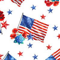 American flags are tossed across the design amongst a scatter of floral bouquets and small stars, lending a prideful flair to this patriotic piece. Larger flags are about 3", 'American Flags' from the 'Red, White & Sweet' collection by Nicole DeCamp for Benartex Fabrics.