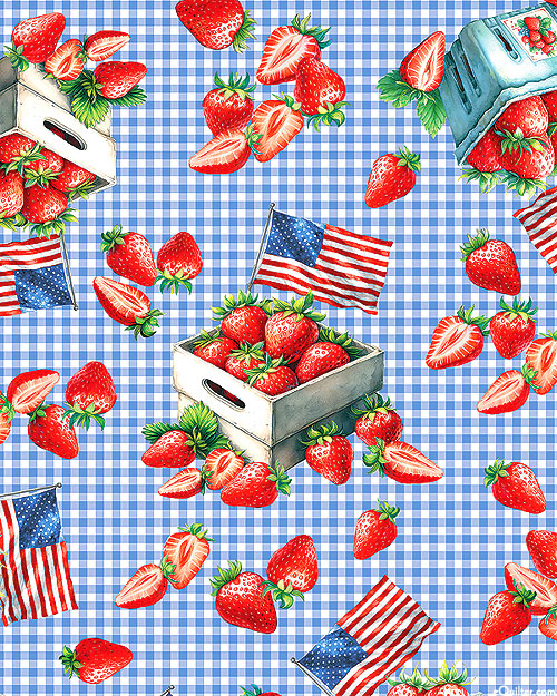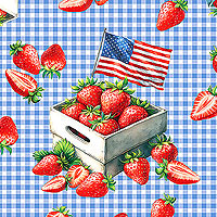 Tossed against a gingham check background are small boxes filled with sweet and summery strawberries decorated with American flags, lending a prideful flair to this patriotic piece. Larger berry baskets are about 3-1/4", 'Strawberry Celebration' from the 'Red, White & Sweet' collection by Nicole DeCamp for Benartex Fabrics.