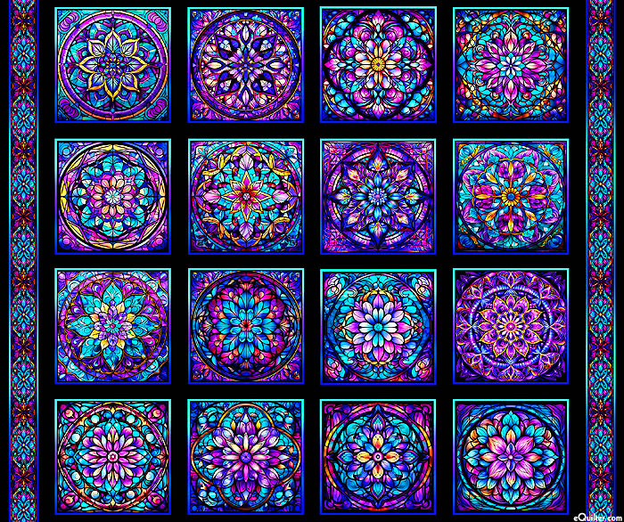 A kaleidoscopic cascade of vibrant florals comes to life like radiant sunshine through the stained glass features of the mesmerizing medallions of this picturesque panel. Digitally printed, 36" panel, panel has sixteen frames about 8" x 8", from the 'Royale' collection by Dan Morris for Quilting Treasures.