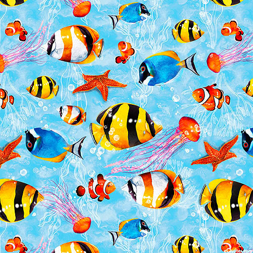 A vibrant variety of colorful reef fish are scattered across this aquatic design. Larger fish are about 1-3/4", from the 'Deep Sea' collection by Whistler Studios for Windham Fabrics.