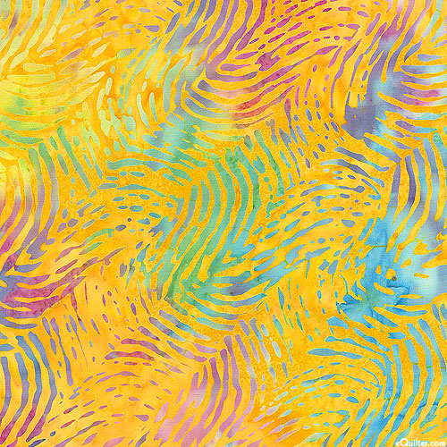 Rippling textures that ebb and flow are depicted in vivid hues within mottled batik textures. Batik, larger waves are about 3", from the 'Baliscapes - Pizzazz' collection by Anthology Fabrics.