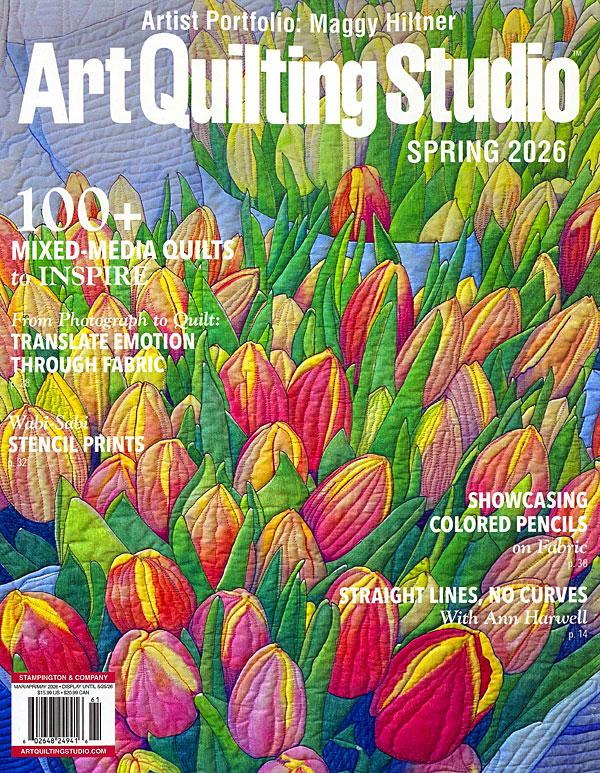 Art Quilting Studio provides a playful and informative forum where quilt enthusiasts from all walks of life can cross-pollinate to share techniques, ideas and inspiration. Join us on this journey where everyone is invited to share in the joy of quilting. In this issue: Special Features - An American in Paris by Linda Diak; Embracing Shadows by Jan Soules; Goddess: Graceful, Elegant & Celebratory by Regina Dunn; From Photograph to Quilt: Translating Emotion Through Fabric by Tasha Owen; Wabi-Sabi Stencil Prints on Black by Mary Elmusa; Colorful Creations: Quilting with Colored Pencils by Lauretta Crites; Mixing it up With Black & White by Sherry Shine; The Limitless Creativity of Spontaneous Curves by Lorraine Woodruff-Long; Ithaka: Quilts About Life by Alicia Merrett; An Illustrated Guide to Questionable Proportions by Kathy Surprenant; Threads & Trails: Mom's Wildscapes by Jamila Colozzi; Another Day in Africa by Lynn van Wyk; Still Life That Pops - Literally! by Margaret Grottenthaler; Grown Through Exhibition Calls for Entry by Darcy Hunter; Thread-on-Fabric Still Life by Deidre Scherer; The Fearless Freedom of No Rules by Debbie Schultze; Quilting Ruins by Joke Buursma. From Departments - Series Showcase: Straight Lines, No Curves by Ann Harwell; Advice from the Artist by Our Contributors; Artist Portfolio: Appreciating Life With Maggy Rozycki Hiltner by Danielle Williams; Art Quilt Walking: A Walking Collage by Kim Goings; Quilting the Odd & Unusual: Quilted Hearts by Danielle Williams; Patchworks by Our Contributors; The Last Page: Let Your Inner Child Loose by Diane L. Murtha. Art Quilting Studio Magazine - Spring 2026.