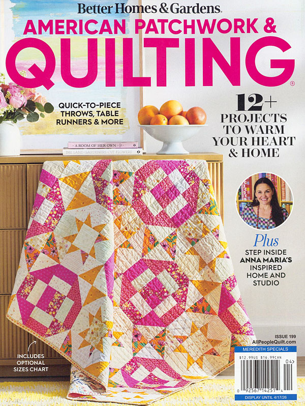 In this issue of American Patchwork & Quilting - enjoy more than 12 new projects designed to warm your heart and home including throws, table runners and more! In addition, explore Anna Maria's inspired home and studio. Projects include: Flutter & Glow (Pillows) by Anna Maria Parry; Precut Challenge (table topper) by Renee Nanneman and Charisma Horton; Gather in the Garden by Pam and Nicky Lintott; Rhapsody by Amy Lollis; Finer Things by Monique Jacobs; Pieceful Morning (table runner) by Lacey Pietig; Wanderlust by Textile Outpost; Marbles by Kadee Porter; Sweet Inheritance by Lissa Alexander; Stitch & Gift (kitchen accessories) by Joanna Burgarino and Doris Brunnette. American Patchwork & Quilting Magazine, Issue 199, Spring, 2026.