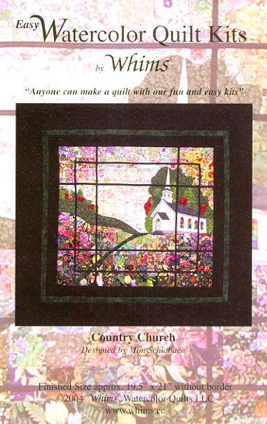 Although this wall hanging looks impressive and difficult, you will find that it is one of the easiest quilts you will ever make! This kit includes a pattern, placement guide, instructions, and enough presorted 2" x 2" fabric squares and appliqué fabric to do everything but the borders. Additional fabric requirement: 3/4 yd of batting; 3/4 yd of backing fabric; fusible web. Quilt-Fuse is highly recommended, it saves a lot of sewing time. Kit includes 100% cotton 2" squares, applique fabrics, patterns, placement guide, instructions, and color photo. Finished size without border is 19 1/2" x 24". 'Country Church' by Mim Schlabach of Whims Watercolor Quilts.