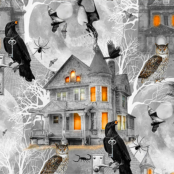 A haunted house decorated with spiderwebs, bats, owls, and ravens lends a festive flair to the this spooky design. Haunted Houses are about 5", 'Fright Night' from the 'Full Moon' collection by Whistler Studios for Windham Fabrics.