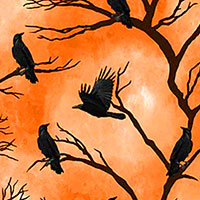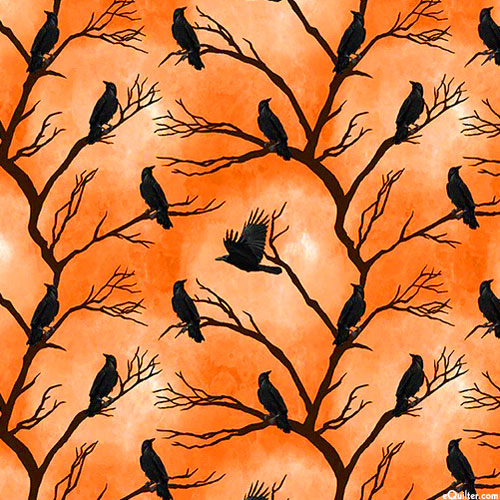 Ravens perch on the thin branches of a leafless tree, lending a festive flair to this Halloween-themed design. Ravens are about 1", 'Raven Roost' from the 'Full Moon' collection by Whistler Studios for Windham Fabrics.
