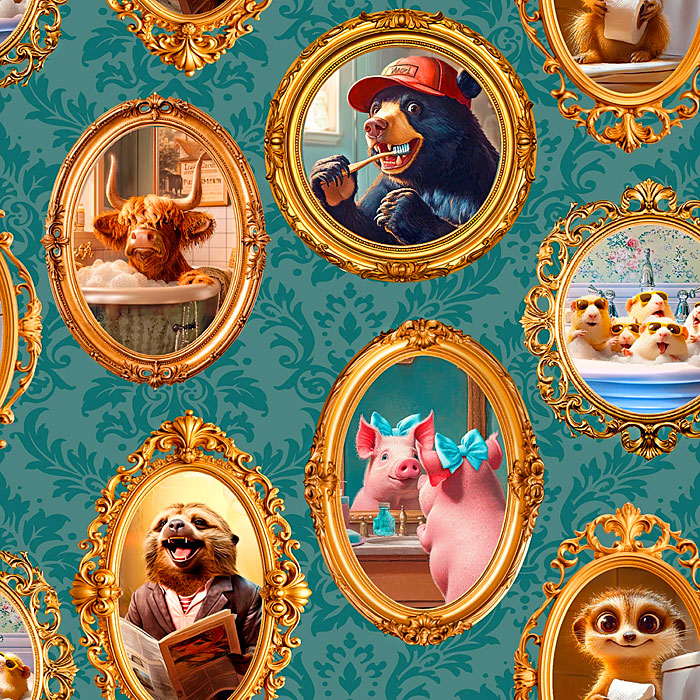 Whimsical portraits featuring various wild animals acting like humans are hung up against a charming wallpaper background. Digitally printed, 'All Framed Up' from the 'Please Seat Yourself' collection by Jim Baldwin for 3 Wishes Fabric.