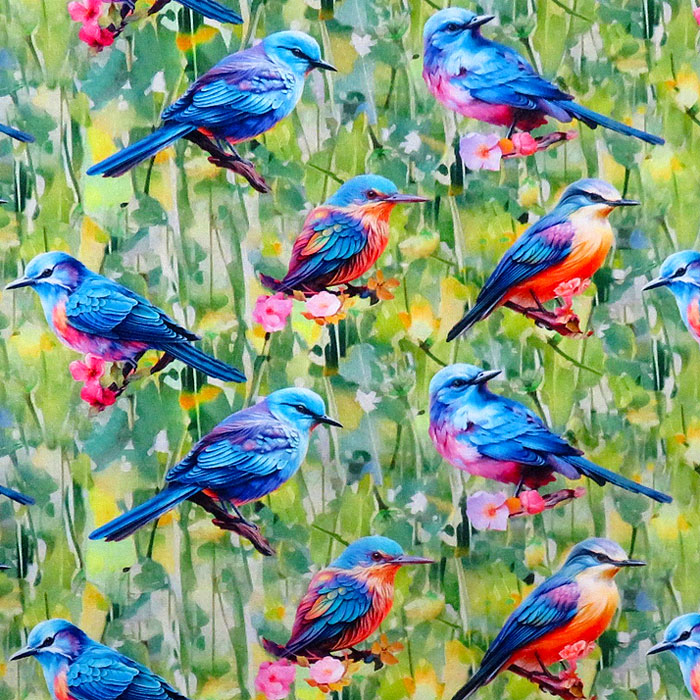 Small and colorful birds are seen gathered together in the forest as they perch peacefully on small flowers. Digitally printed, 'Bird Perch Green', from the 'Spring Into Beauty' collection by Shawna Stewart for 3 Wishes Fabric.
