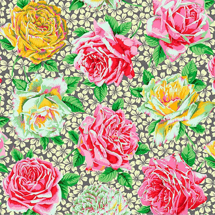 A lush landscape of flourishing flowers coalesce to create a captivating garden gala of texture and tone.Larger flowers are about 7-1/2", 'Rose Bloom' from the 'February 2026 Kaffe Fassett Collective' collection by Philip Jacobs for Free Spirit.