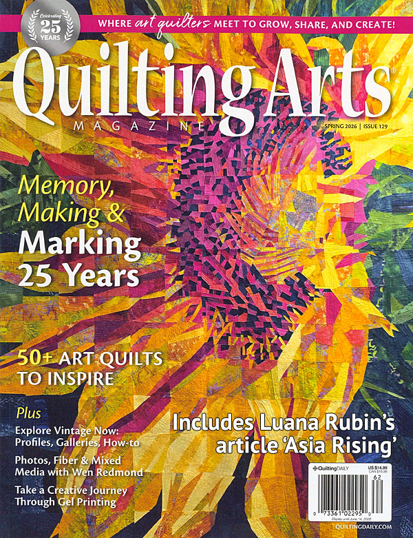The Spring issue invites you to pore over pages bursting with color, and articles packed with take- aways that will leave you inspired. Featured within, a very special article titled "Asia Rising" highlighting the changes and trends happening within the Asian quilting culture by our very own Luana Rubin. The cover also features one of Luana's images from the article! From Design & Stitch: On Memory, Making & Marking 25 Years by Pokey Bolton; Cloth Paper Scissors: The Art of Noticing by Wen Redmond; Reclaiming the Gee's Bend Legacy by Tangular Irby; Stitching the Past into the Present by Susan L. Griffin; Modern Artifacts at the Intersection of Archaeology, Art and Space by Jane Davila; Instant Ancestors by Vivika Hansen DeNegre; Asia Rising by Luana Rubin. From Profile & Gallery: International Quilt Festival; Art Quilt Elements 2026; Innovative Projects: Portraits Reimagined by Fuzzy Mall; Artists Who Shaped Us - Looking Back on 25 years; Stitched Histories - A Gallery of Contemporary Art Quilts Rooted in Family and Memory by Mary Ann Tipple; Reader Challenge Gallery. Quilting Arts Magazine - Issue 129, Spring 2026.