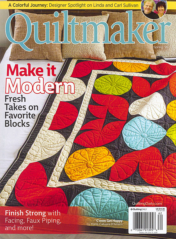 In this Spring issue of Quiltmaker, read featured articles: Modern Designers to Follow; Skill Builder: Let's Face It by Diane Harris; Lines + Triangles = Squares: A Tutorial in Improvisational Piecing by Maria Shell; Designer Spotlight with Linda and Carl Sullivan; Modern Traditional Quilts: A New Take on Old Designs by Riane Menardi Morrison; Free Block Pattern Videos. Patterns include: Assertive by Kristie Shreffler; Savannah Spring by Debora Rivera; Timepiece by Dawn Fisher Polomski; Star-to-Star by Sarah Maxwell; C'mon Get Happy by Marie Catuara D'Amico; Sisterhood (Easy) by Lyn Brown; Pink Grapefruit by Coleen Merte; Saturated Stars by Linda and Carl Sullivan; Bird's-Eye View by Mary Kay Davis; Tulip Waves by Robin Koehler; Churn Dash Flash by Nancy Allen; Mod Cabin by Katie Young; Line Leader (Easy) by Chris Varvares. Quiltmaker Magazine - Spring 2026 issue.