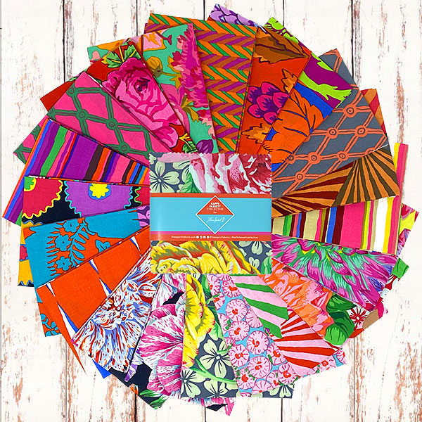 'The Kaffe Fassett February 2026: Warm' charm pack by the Kaffe Fassett Collective for Free Spirit, pack includes forty-two 5" x 5" squares.