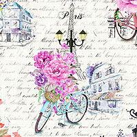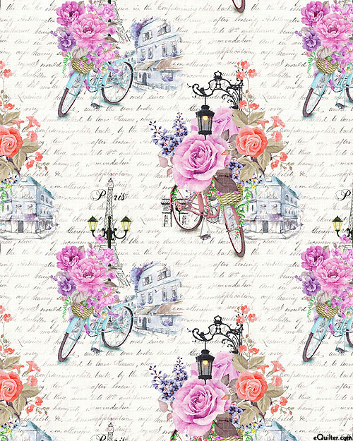 Parisian flower delivery bicycles full of vibrant bouquets are artfully displayed against a background of elegantly handwritten French script. Digitally printed, larger illustrations are about 5-1/4", 'Boulevard St. Germain' from the 'We'll Always Have Paris' collection by Michael Miller Fabrics.