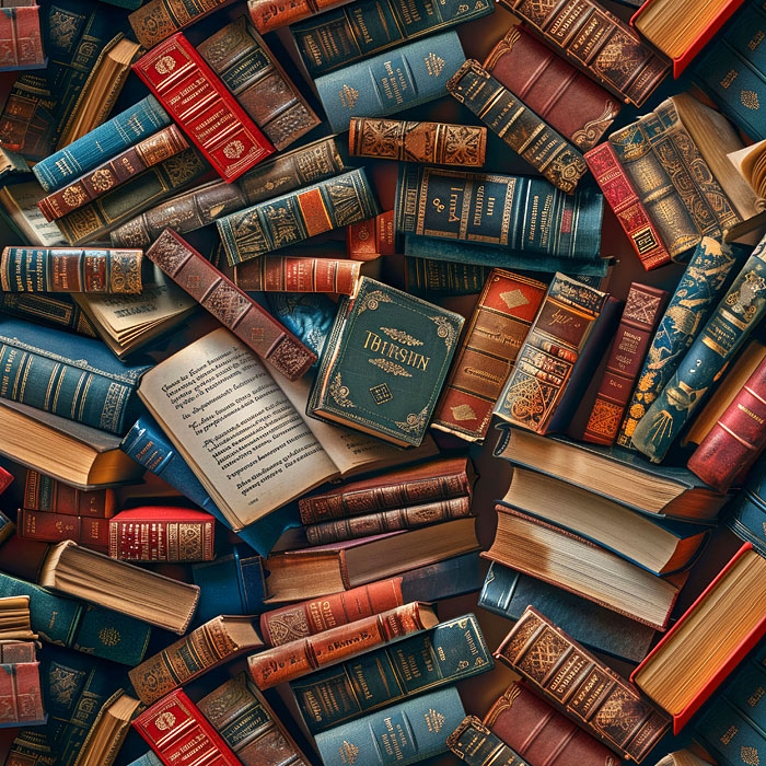 Tossed recklessly into a pile are a collection of faded and worn tomes containing knowledge from ages long past. 108" wide quilt backing, digitally printed, larger books are about 2-3/4", 'Large Tossed Books' by the Rubin Design Studio, designed exclusively for eQuilter.