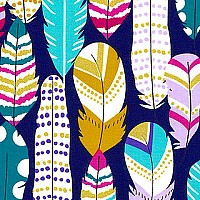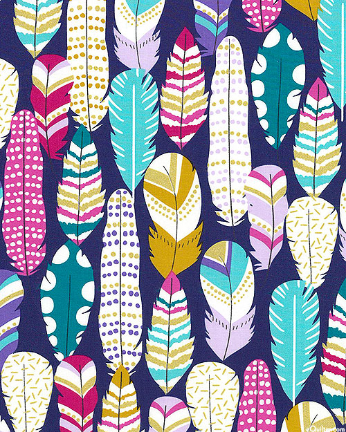 Large feathers sporting spots, chevrons and speckles point the way down the length of the fabric. With gold metallic and such modern designs, these feathers must be from the most unusual of birds. Larger feathers are about 4 1/2" with gold metallic, 'Plucked' from the 'Arrow Flight' collection by Michael Miller Fabrics.