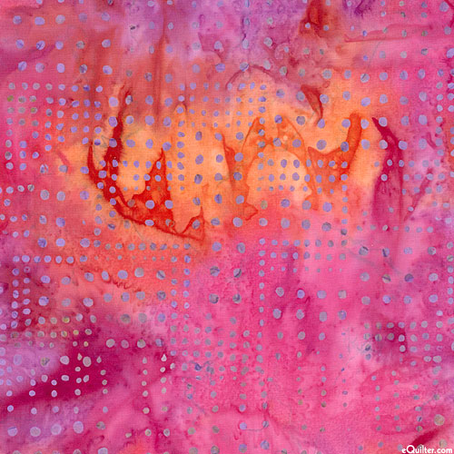 A dotted grid of varied size that lends depth and motion to the design is depicted in vivid hues within mottled batik textures. Batik, larger dots are about 3/16", 'Variegated Dots' from the 'Bali Dot Craze' collection by Benartex Fabrics.