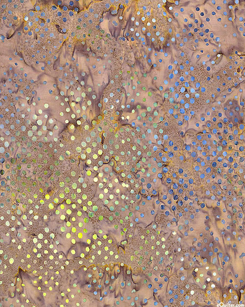 Neatly arranged dots that coalesce into diamond shapes are depicted in vivid hues within mottled batik textures. Batik, larger dots are about 3/16", 'Diamond Dot' from the 'Bali Dot Craze' collection by Benartex Fabrics.
