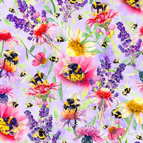 A lush landscape of flourishing flowers coalesce to create a captivating garden gala of texture and tone as happy honeybees buzz busily across the design. Digitally printed, larger bees are about 1", from the 'Buzzin Around' collection by Hoffman Fabrics.