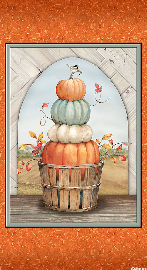 In this panel, several pumpkins are piled high as an adorably small bird perches on the very top. 24" panel, from the 'Bountiful' collection by Sandy Clough for P&B Textiles.