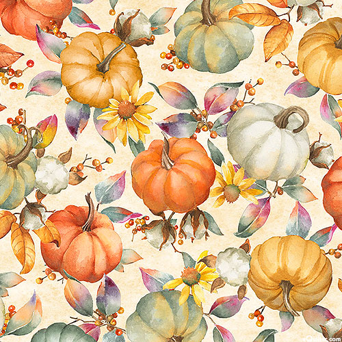 A happy harvest scene comes to life across this beautiful design as plump pumpkins and radiant sunflowers are tossed all over. From the 'Bountiful' collection by Sandy Clough for P&B Textiles.