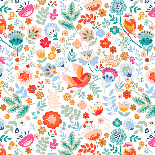 Small birds and butterflies flit between the leafy branches of the forest above a flowery garden in an elegant expression of nature's charm. From the 'Birdsong' collection by Geeranjali Behera for P&B Textiles.