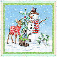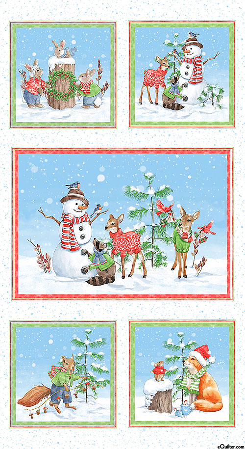 A festive scene comes to life as a merry mix of snowmen and forest animals gather together amidst a snowy landscape in the blocks of this Christmas-themed panel. 24" panel, from the 'Frost & Fable' collection by Leslie Trimbach for P&B Textiles.