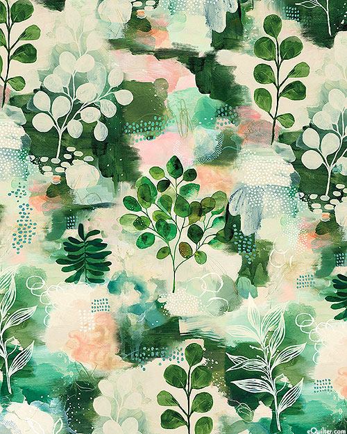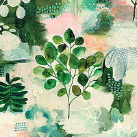 Small shrubs emerge from within a charming collage of painterly textures and vivid hues. From the 'Nature Story' collection by Laura Horn for P&B Textiles.