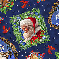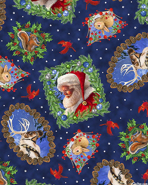 Festive wreaths surround portraits of Santa Claus and various wild animals including cardinal birds, squirrels, reindeer, and rabbits. Digitally printed, larger frames are about 7-3/4", from the 'Season Of Giving' collection by Gina Jane Lee for Quilting Treasures.