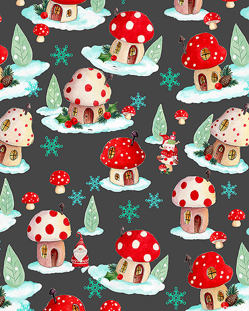 An adorable mushroom village for tiny gnomes sprawls across this fun and festive design. Digitally printed, larger mushroom houses are about 2", from the 'Gnome For The Holidays' collection by Helz Cuppleditch for Quilting Treasures.