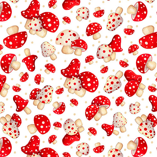 Adorable little mushroom are scattered all across the design with tiny polka dots dappled in the space between. Digitally printed, larger mushrooms are about 1-1/4", from the 'Gnome For The Holidays' collection by Helz Cuppleditch for Quilting Treasures.