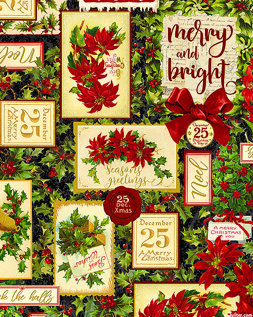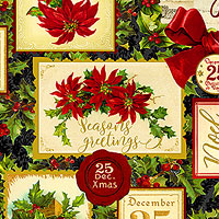 A merry mix of festive motifs and seasonal greetings are scattered across the design including poinsettias, holly, stamps, and ribbons. Digitally printed, larger wreaths are about 4-1/2", from the 'Poinsettia Greetings' collection by Tina Higgins for Quilting Treasures.