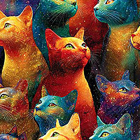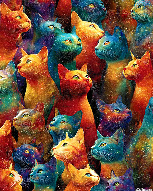 Groovy kitties colored in a vibrant variety of hues are depicted across the design. Digitally printed, 'Galaxy Cats'. Printed in the USA.