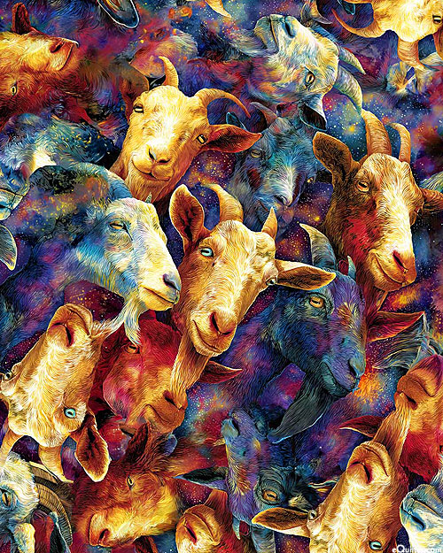 Groovy goats colored in a vibrant variety of hues are depicted across the design. Digitally printed, 'Galaxy Goats'. Printed in the USA.