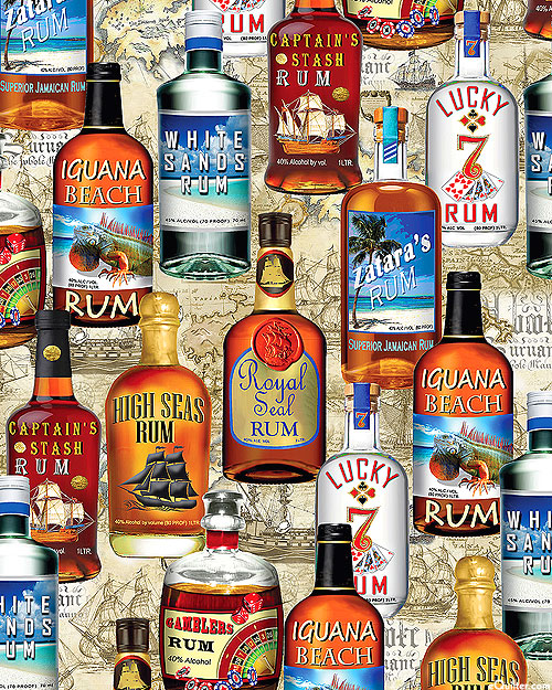 This pattern features realistic bottles of rum in front of a background of a nautical map. The brands depicted are fictional, and have a focus on pirates and tropical beaches. Taller bottles are about 4-3/4", 'Rum' from the 'Top Shelf' collection by Kanvas Studio for Benartex.