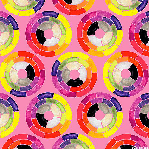 Color wheels one might use as a paint palette are scattered against a solid background in this charming design. Larger circles are about 2", 'Wheel of Color' from the 'Mess Maker' collection by The Paper Curator for Michael Miller Fabrics.