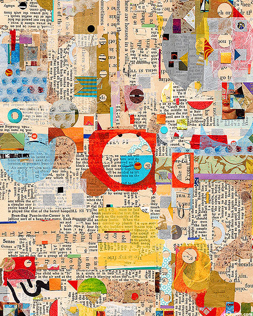 A collage of magazine and newspaper clippings comes together in this abstract piece. Larger scraps are about 2", from the 'Spread The Word' collection by Kathryn Kramer Waters for Blank Textiles.